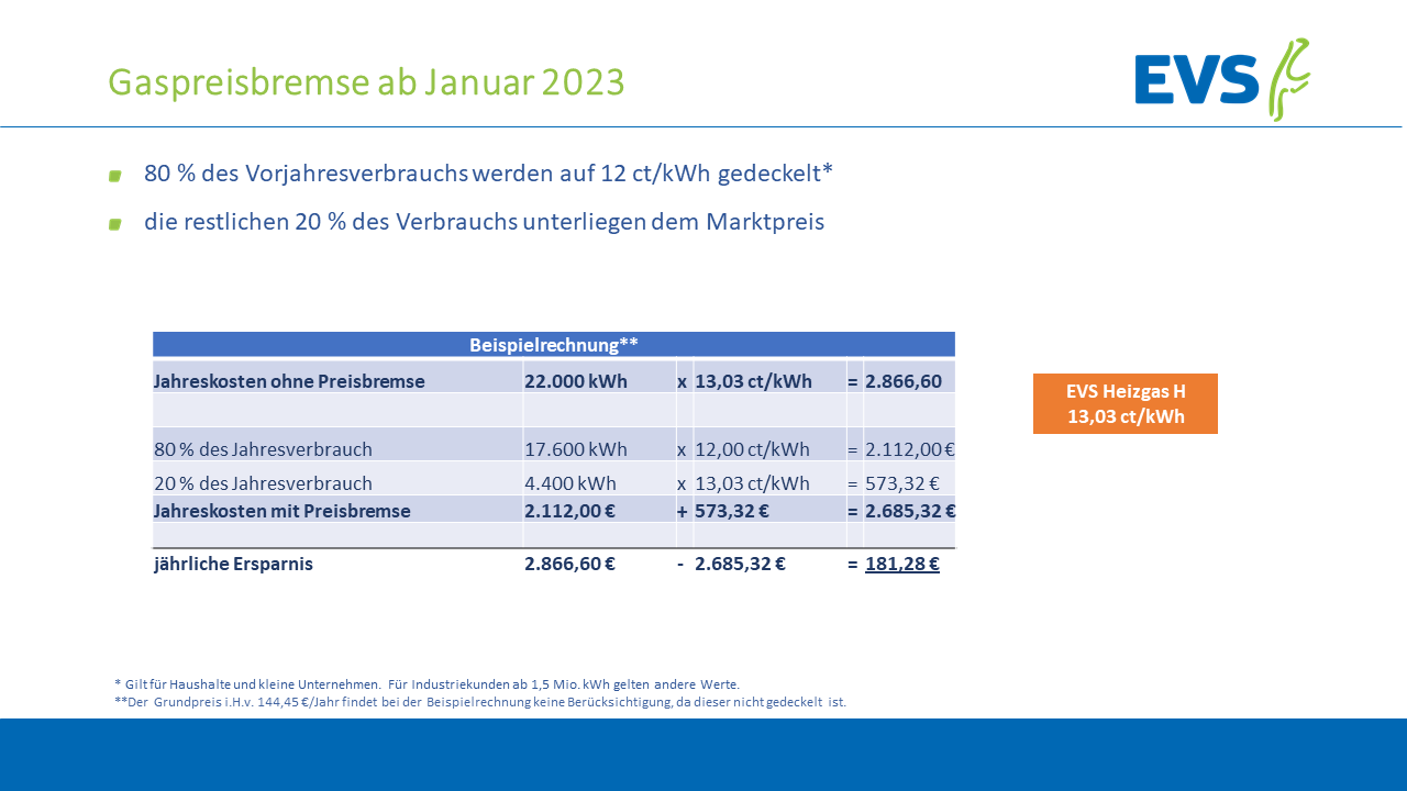 Private Haushalte und Unternehmen, die jährlich weniger als 1,5 Millionen Kilowattstunden an Gas verbrauchen, sowie gesetzlich bestimmte andere Kundengruppen (z.B. Vereine) erhalten 80 Prozent ihres im September 2022 prognostizierten Jahresverbrauchs für 12 Cent pro Kilowattstunde. Wird Fernwärme bezogen, wird der Preis für 80 Prozent des Vorjahresverbrauchs auf 9,5 Cent je Kilowattstunde gedeckelt.