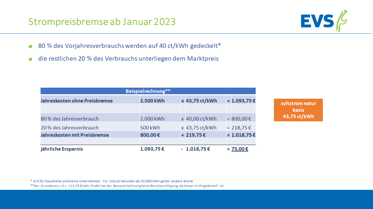 Um die Menschen schnell finanziell zu entlasten, wurden die Preisbremsen vom Gesetzgeber sehr kurzfristig Ende Dezember 2022 beschlossen. Seitdem arbeitet die Energieversorgung Sylt (EVS) mit Hochdruck an der Umsetzung der Preisbremsen. Leider kommt es aufgrund der notwendigen Umstellung der IT-Prozesse zu Verzögerungen beim Versand der Informationsschreiben. Auf eine Sache können sich die Kundinnen und Kunden der EVS aber verlassen: Sie werden unabhängig vom Zustelltermin des Informationsschreibens in voller Höhe von der Entlastung der Energiepreisbremse profitieren.