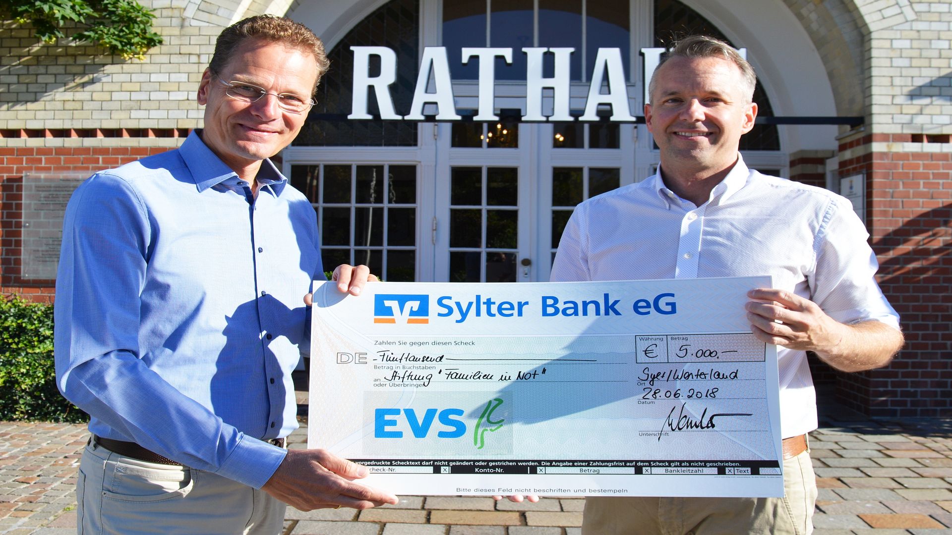Dieser Arbeitstag begann für Bürgermeister Nikolas Häckel mit einer freudigen Überraschung: Georg Wember, Geschäftsführer der Energieversorgung Sylt (EVS), betrat das Chefbüro im Westerländer Rathaus mit einem überdimensionalen Scheck unter dem Arm. Die stolze Summe: 5.000 Euro, die dem Hilfsfonds "Sylter Familien in Not" des Bürgermeisters zugute kommen. "Die erklärte Devise unseres Unternehmens lautet: Von Sylt. Für Sylt. So haben wir in der Vergangenheit bereits häufig insulare Vereine unterstützt. Doch wir möchten auch diejenigen bedenken, die auf unserer Sonneninsel Schattenseiten erleben. Deshalb haben wir den Erlös aus dem Speisen- und Getränkeverkauf bei unserem Tag der offenen Tür, der sich auf 3.600 Euro belief, gerne auf 5.000 Euro aufgerundet", unterstrich Georg Wember. "Tatsächlich gibt es auf Sylt mehr Not als mancher denkt. Jahr für Jahr leistet der Fonds in etwa 20 Fällen schnelle, unbürokratische Hilfe", erläuterte Nikolas Häckel. Über die finanzielle Unterstützung hinaus helfe man den Betroffenen aber auch anderweitig, etwa durch die Vermittlung geeigneter Anträge und Ansprechpartner. "Für diese tolle Spende gilt der EVS mein ganz besonderer Dank", betonte der Bürgermeister abschließend.