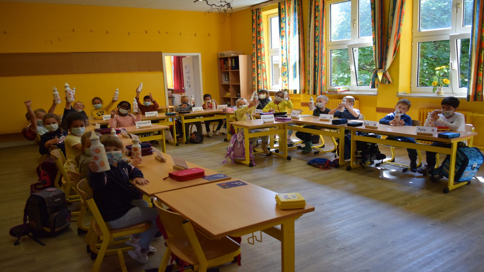 Die Erstklässler durften sich über eine coole und vor allem wieder befüllbare Trinkflasche der Firma „MIZU“ freuen. Die Flaschen fassen jeweils 0,5 Liter und sind kindgerecht mit Motiven wie einem Schulranzen, Buntstiften, aber auch der markanten Sylter Silhouette versehen.