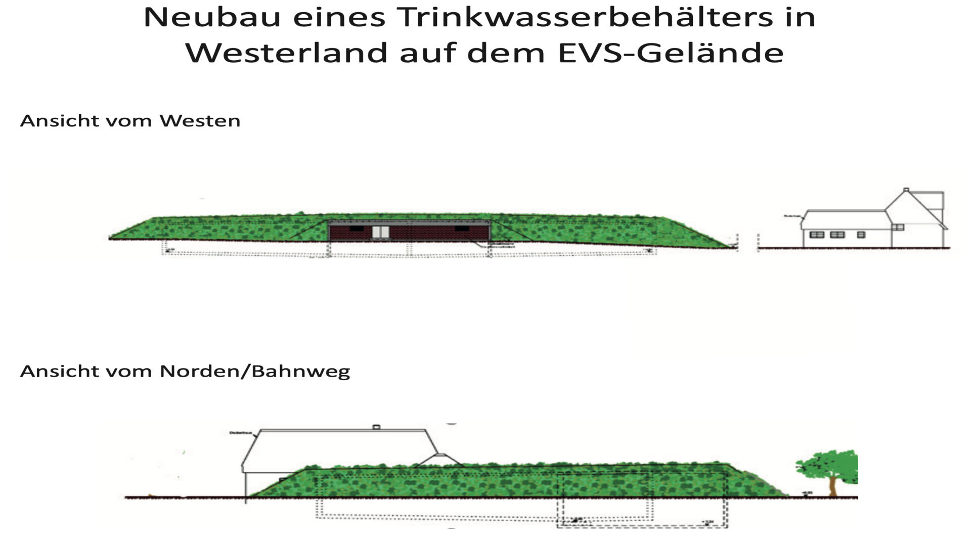 Vor kurzem begann auf dem EVS-Gelände am Bahnweg in Westerland der Neubau des Trinkwasserbehälters mit 2 x 2.500 m³ Nutzvolumen. Die beiden Wasserkammern des neuen Trinkwasserbehälters haben einen charakteristischen, achteckigen Grundriss und werden in bewehrter Stahlbetonbauweise konstruiert. In List wird ein Behälter mit viereckigen Grundrissen der zwei Wasserkammern gebaut, da Speichervolumen und Platzverhältnisse diese Bauweise zulassen.